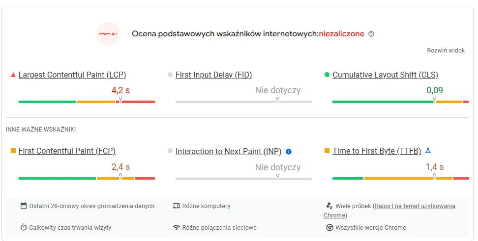- Largest Contentful Paint (LCP) – czas załadowania się największego elementu na stronie – bloku tekstu albo grafiki. Optymalna wartość to 2,5 sekundy.