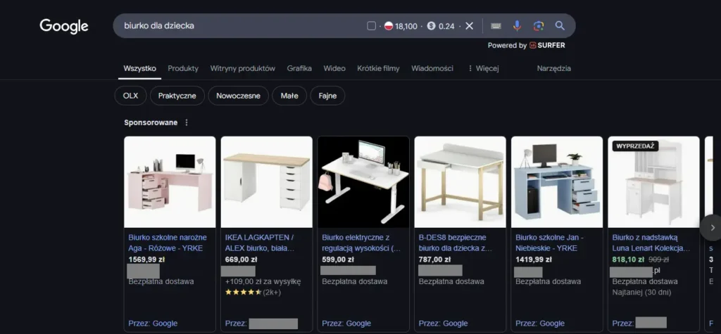 - produktowe – pokazują przedmiot poszukiwany przez internautę.