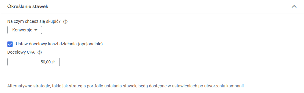 - Ustaw odpowiednie wartości docelowe, np. dla tCPA ustal docelowy koszt pozyskania klienta (np. 50 zł), a dla tROAS ustaw wartość docelowego zwrotu z inwestycji (np. 400%).