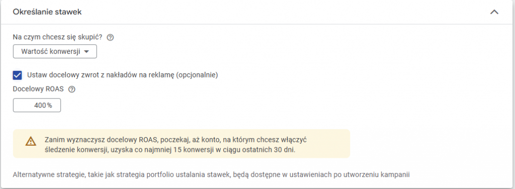 - w przypadku strategii docelowego ROAS potrzeba minimum 15 transakcji z przypisaną wartością w ostatnich 30 dniach (przy kampaniach produktowych – przynajmniej 20 w ciągu 45 dni);