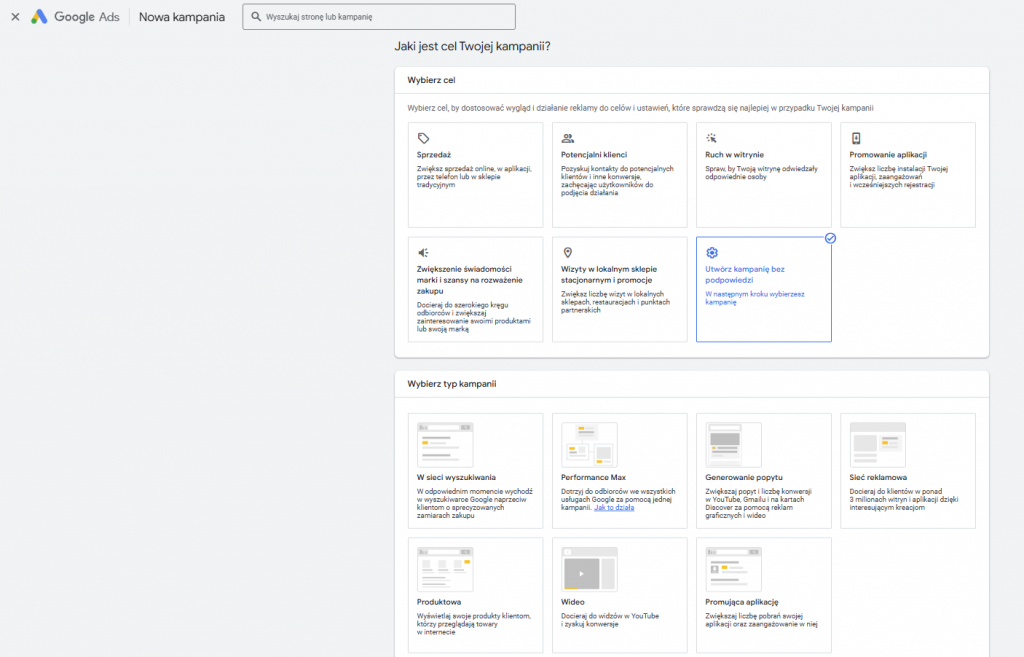 - W panelu nawigacyjnym kliknij „+ Kampania” i wybierz typ kampanii, który chcesz utworzyć (np. „Wyszukiwanie” dla kampanii reklamowej w Google).