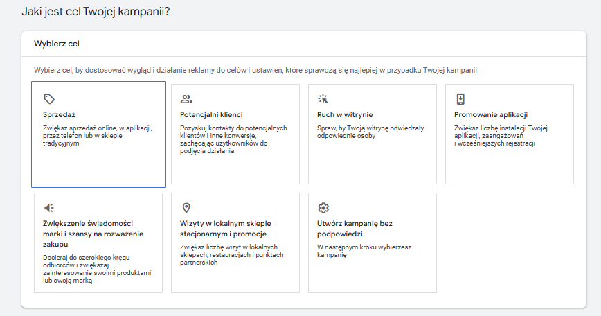 Google zapyta Cię o cel kampanii. Możesz wybrać opcje, takie jak: „Zwiększenie liczby odwiedzin na stronie”, „Pozyskiwanie leadów” lub „Zwiększenie sprzedaży”. Wybór celu pomoże Google dostosować ustawienia kampanii.