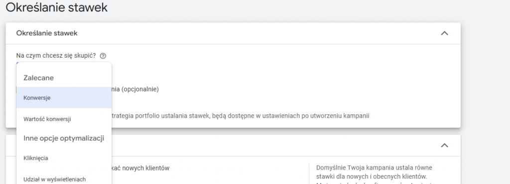 Pierwszym zadaniem jest decyzja, która strategia Google Ads Smart Bidding będzie najlepiej odpowiadać Twoim celom biznesowym. Do wyboru masz kilka opcji: