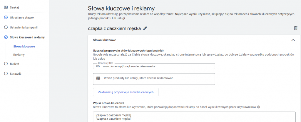 Wybór grupy reklam i słów kluczowych:
