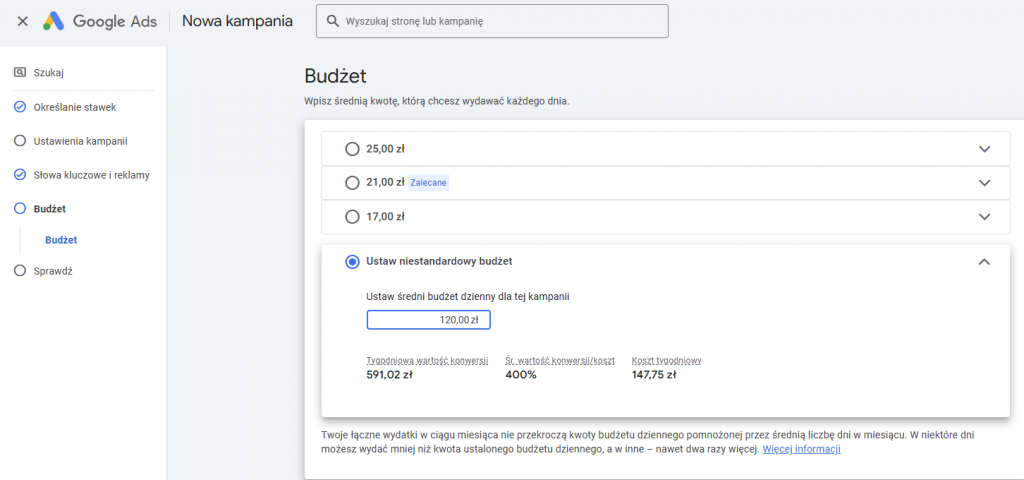 Określ dzienny budżet kampanii. Google będzie starało się wydatkować Twój kapitał w sposób najbardziej efektywny, bazując na wybranej strategii Smart Bidding.