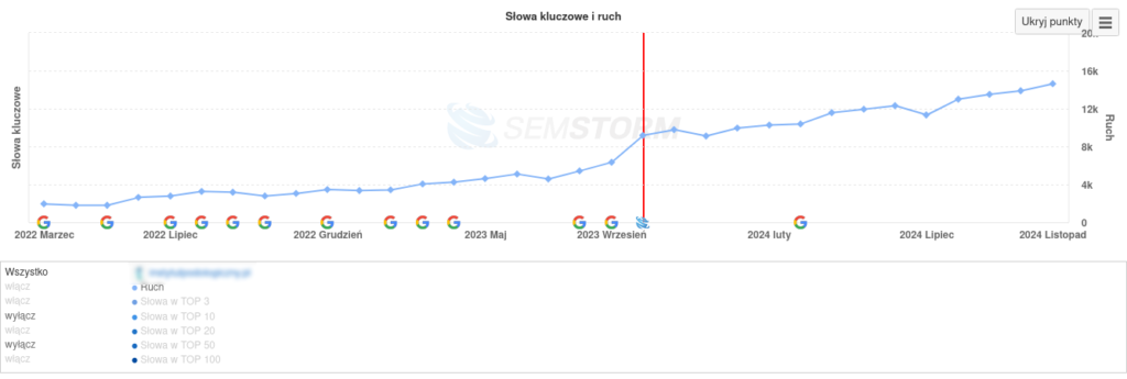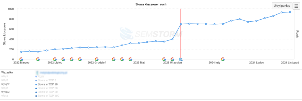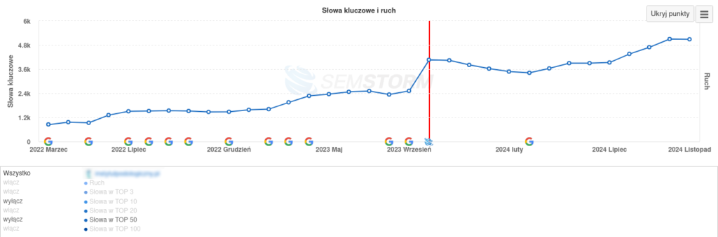 Przy rozpoczynaniu współpracy w 2022 roku 843 frazy kluczowe plasowały się w pierwszych 50 wynikach wyszukiwania. Dzięki wdrożonej strategii w listopadzie 2024 roku w tej samej kategorii znalazło się ponad 5000 haseł, co stanowi spektakularny, bo ponad 500% wzrost.