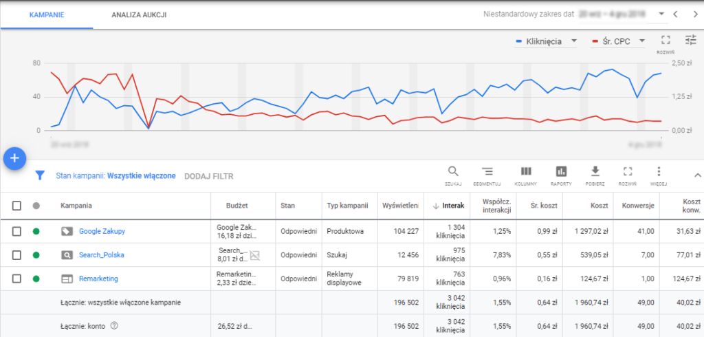 Dodatkowo do optymalizacji kampanii od początku jej trwania wykorzystujemy optymalizator sztucznej inteligencji, który pozwolił nam obniżyć koszt za kliknięcie w reklamę o 65% co automatycznie przełożyło się na wzrost liczby kliknięć o 184 %. Efekt obniżenia wypracowaliśmy ze stawki rynkowej na poziomie 0,54 zł do 0,19 zł obecnie. Zakładając, że mamy do dyspozycji 4000 zł i stawkę za kliknięcie 0,54 zł jesteśmy wstanie wygenerować 7407 wejść na stronę. Przy obniżonej stawce 0,19 zł przy tym samym budżecie jesteśmy wstanie wypracować 21053 wejść. Przy identycznej kwocie inwestycji możemy wypracować 13646 wejść więcej.