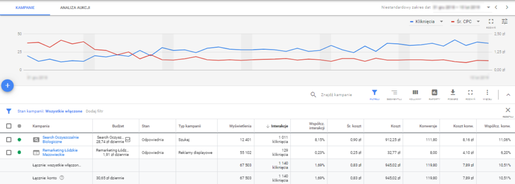 Przygotowaliśmy kampanię Google Ads w sieci wyszukiwania oraz sieci reklamowej (Remarketing i Display) z budżetem miesięcznym 660 zł od lipca do lutego. Ponieważ kampania przynosiła bardzo pozytywny odzew telefoniczny oraz wypełniane formularze kontaktowe od marca budżet przeznaczony bezpośrednio do Google wzrósł do 900 zł.
