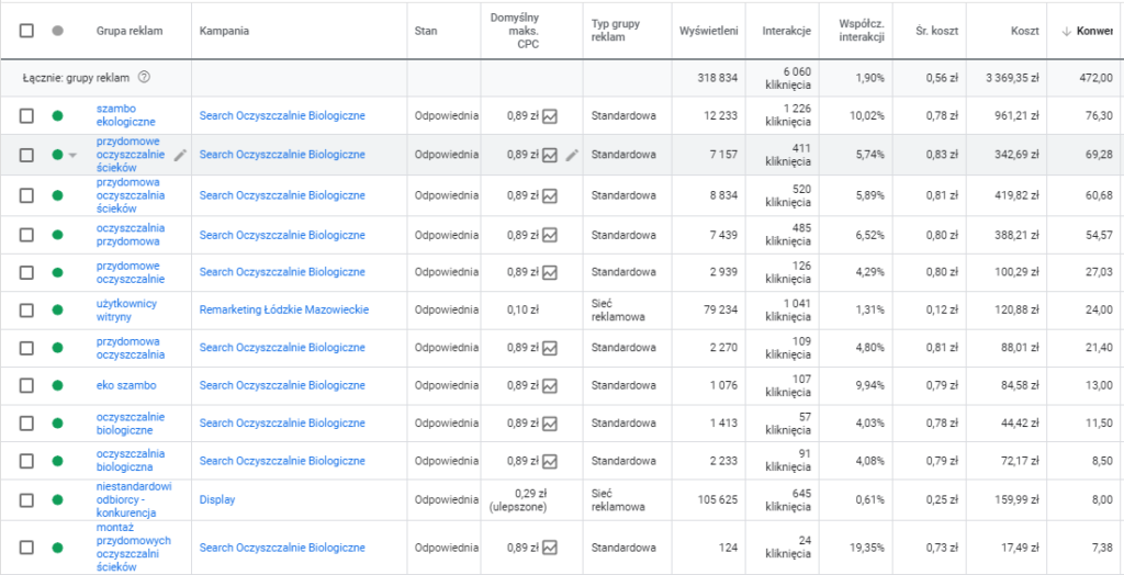 Do optymalizacji kampanii od początku jej trwania wykorzystujemy optymalizator sztucznej inteligencji, który pozwolił nam obniżyć koszt za kliknięcie w reklamę o 65% co automatycznie przełożyło się na wzrost liczby kliknięć o 189 %. Efekt obniżenia wypracowaliśmy ze stawki rynkowej na poziomie 1,88 zł do 0,65 zł obecnie. Zakładając, że mamy do dyspozycji 4000 zł i stawkę za kliknięcie 1,88 zł jesteśmy wstanie wygenerować 2128 wejść na stronę. Przy obniżonej stawce 0,65 zł przy tym samym budżecie jesteśmy wstanie wypracować 6154 wejść. Przy identycznej kwocie inwestycji możemy wypracować 4326 wejść więcej.