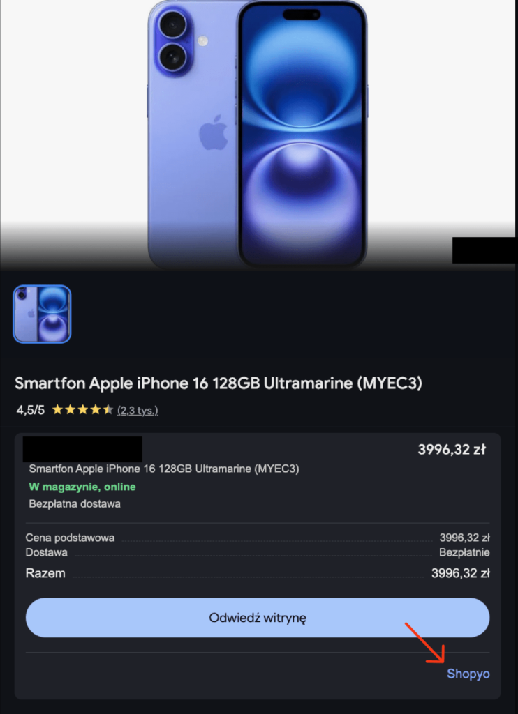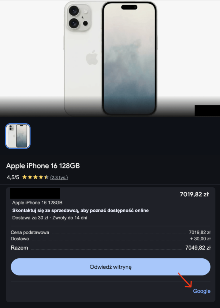 CSS to więc godna alternatywa dla Shopping, która oferuje tożsame rozwiązania służące do prowadzenia kampanii produktowych w wyszukiwarce Google. Czy da się więc rozróżnić, z użyciem której funkcjonalności towar został dodany? Oczywiście – wystarczy kliknąć wybrany produkt i spojrzeć na sam dół sekcji.